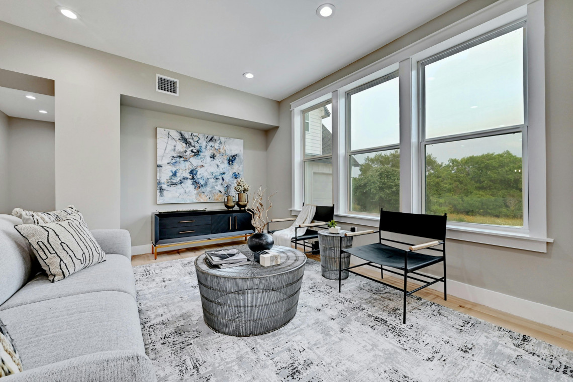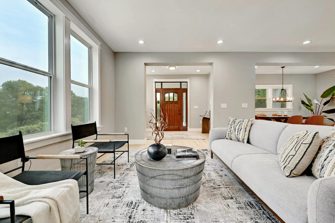 The downstairs of the home is built with the kitchen, living room, and dining room at its center. The updated kitchen is outfitted with crisp, white cabinets and sleek grey counters made of engineered stone. A large island also functions as an eat-in bar for casual dining.