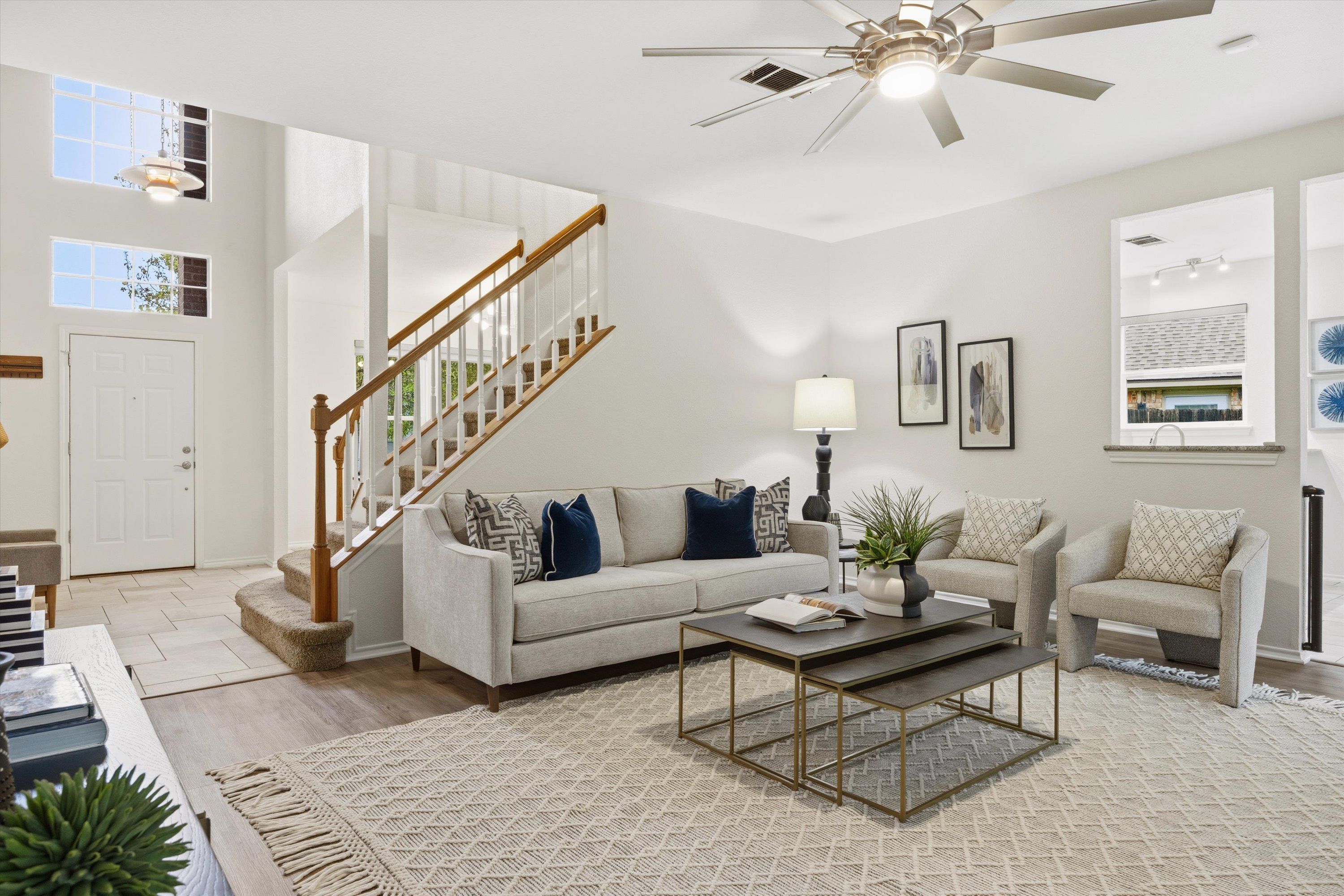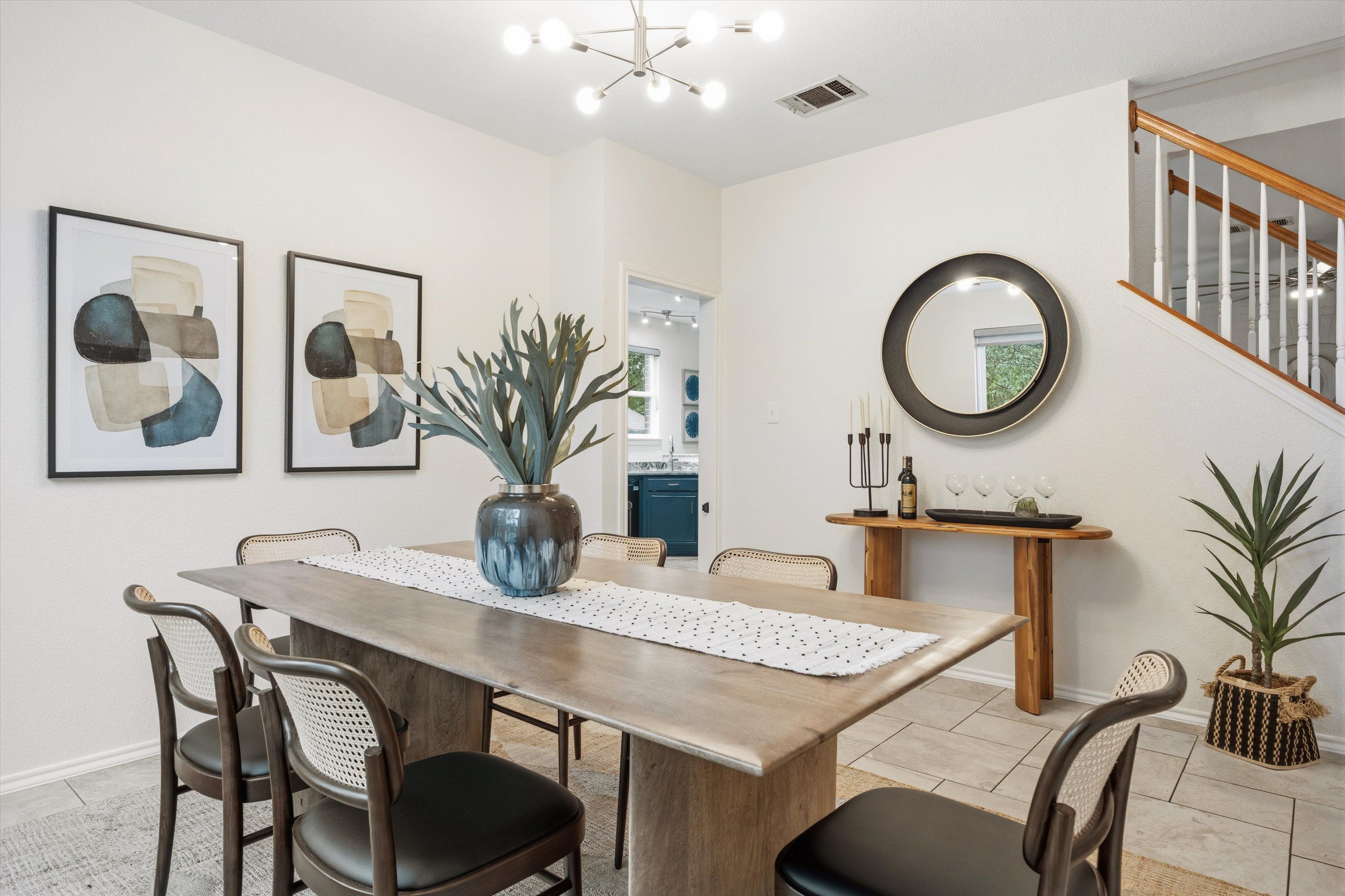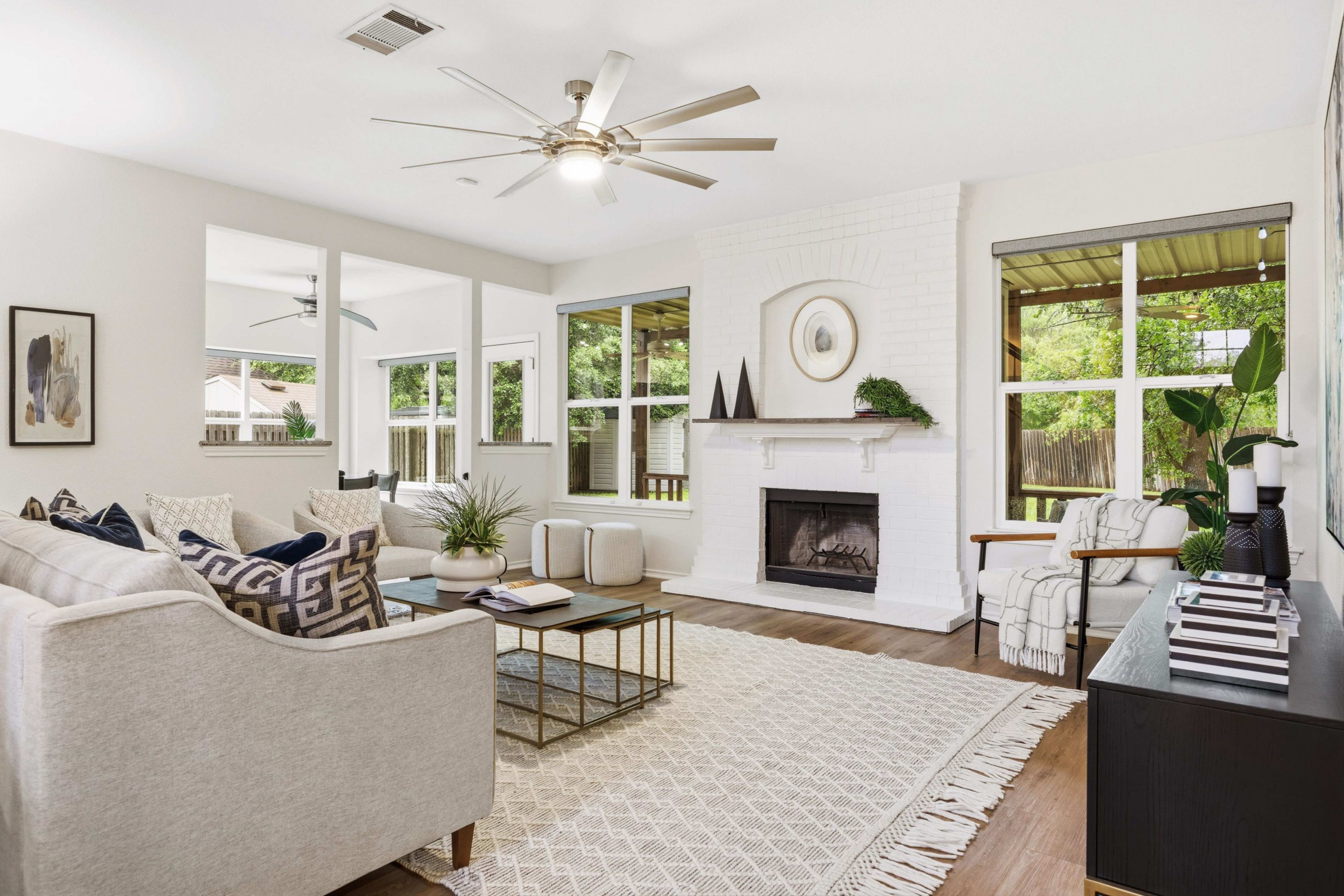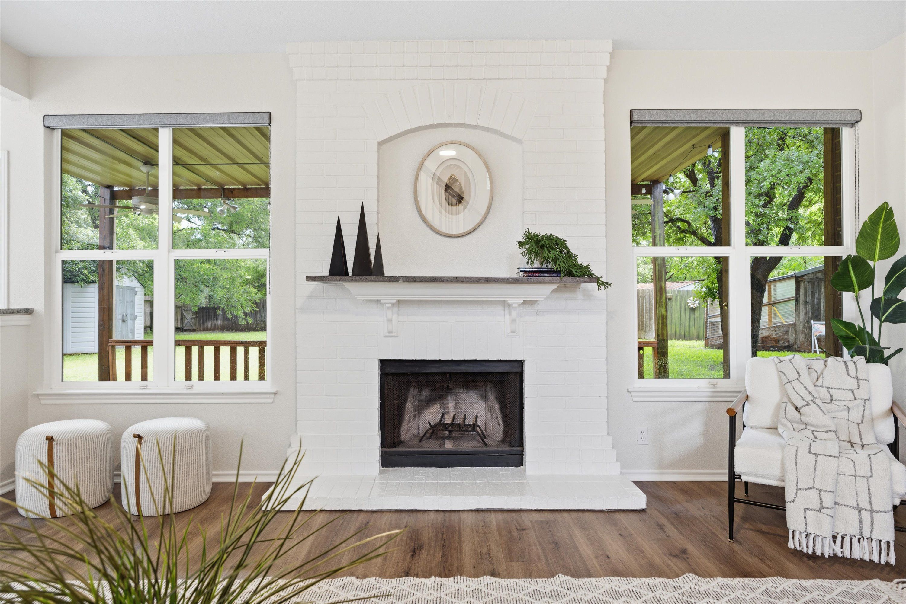 Inside, the home’s comfortable layout is thoughtfully spread across two floors to maximize privacy while also optimizing easy movement between the most-used rooms in the house. The living room anchors the downstairs with an impressive painted brick fireplace and a wall of windows that frames the backyard. The open floor plan conveniently flows from the living room to the kitchen, informal breakfast nook, or the formal dining.