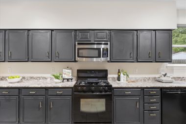 The kitchen is highly efficient without sacrificing style. Dark cabinets are updated with on-trend gold hardware and topped with granite countertops. There’s abundant counter space for meal prep, lots of cabinets for ample storage, and two separate pantries so that everything has its place. An adjoining laundry room with a light and bright window makes it easy to pop in a load of laundry while making dinner. You can grab a quick bite at the eat-in bar or have a casual meal in the breakfast nook while you watch the squirrels play in the trees out back. A formal dining room sits just off the kitchen for the nights you want to slow down and set the table. Whether it’s a laid-back meal at home or holiday dinner in the dining room, the flexible downstairs layout effortlessly adapts to your needs.