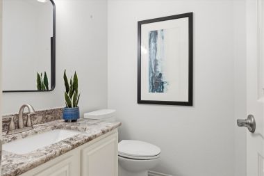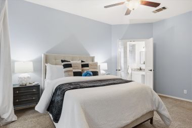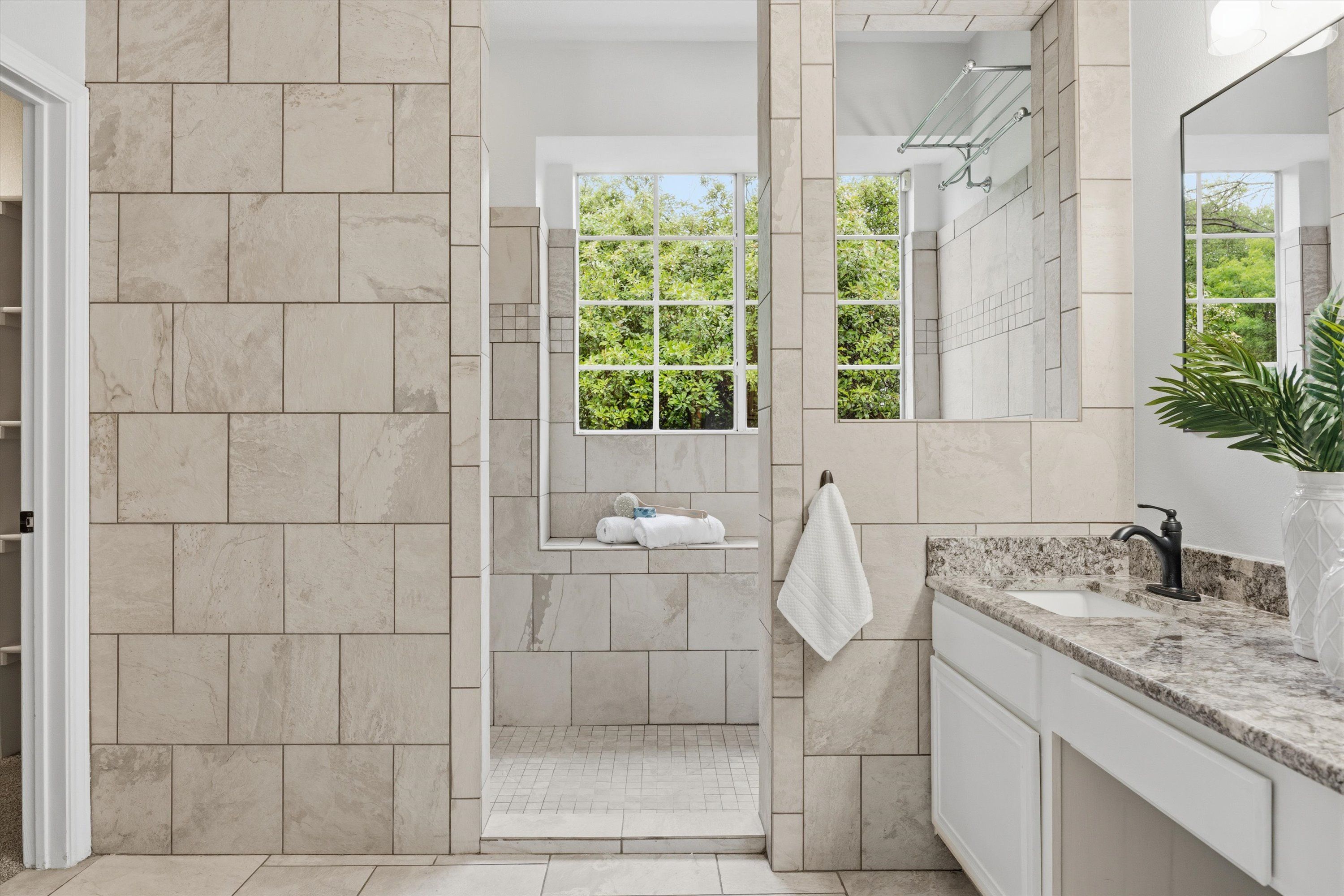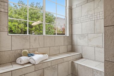 In addition to the communal spaces, the downstairs also includes the primary suite where you can unwind separate and apart from the secondary bedrooms. A large window seat overlooks the private backyard, but it's the primary bath where you'll want to spend all of your time. The walk-in shower with window seat is wrapped in floor-to-ceiling travertine tile and drenched in soft natural light. The double vanity with granite counters is roomy enough to share, and a large walk-in closet has abundant space for all your things. It’s like visiting your own personal spa as you get ready every day.