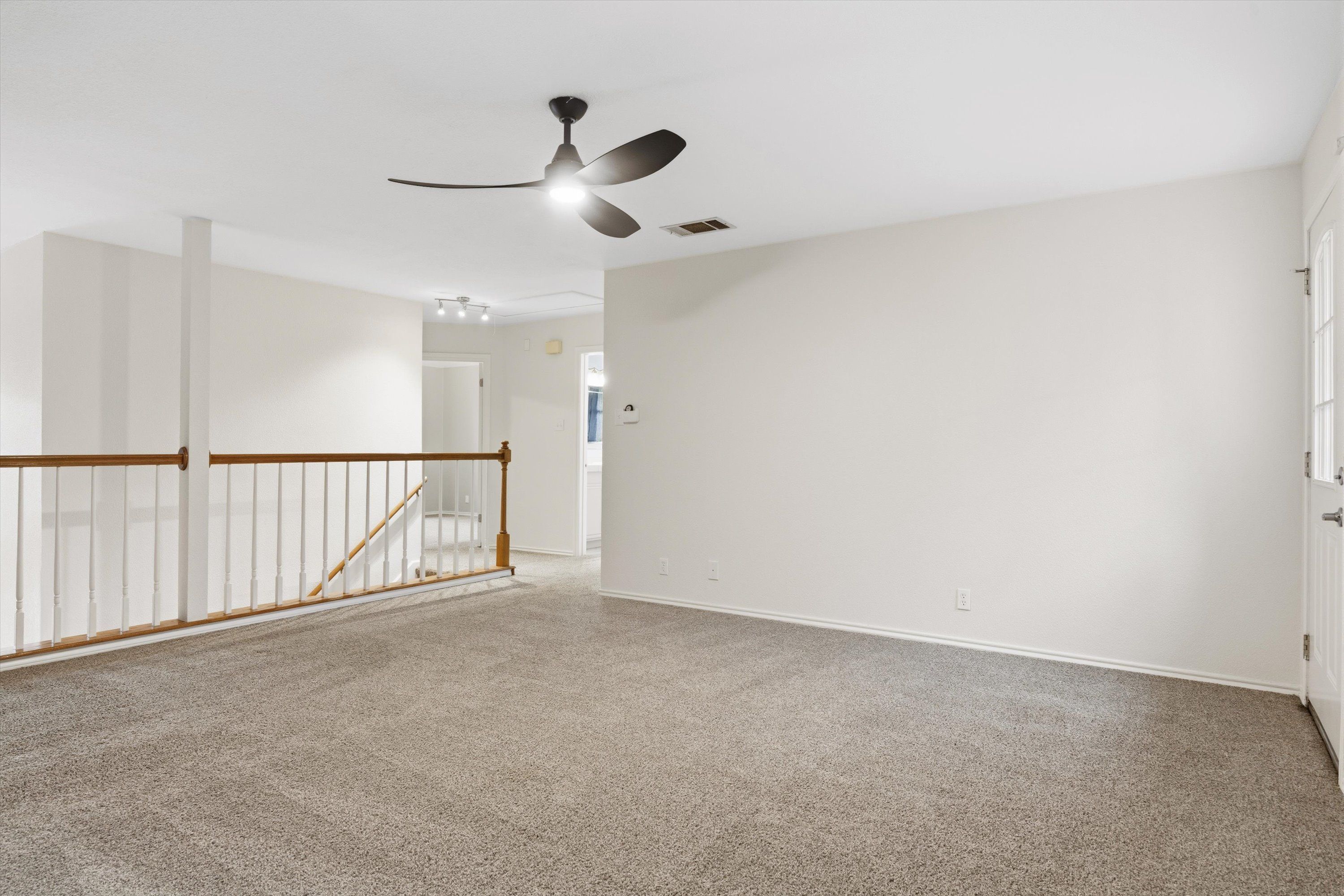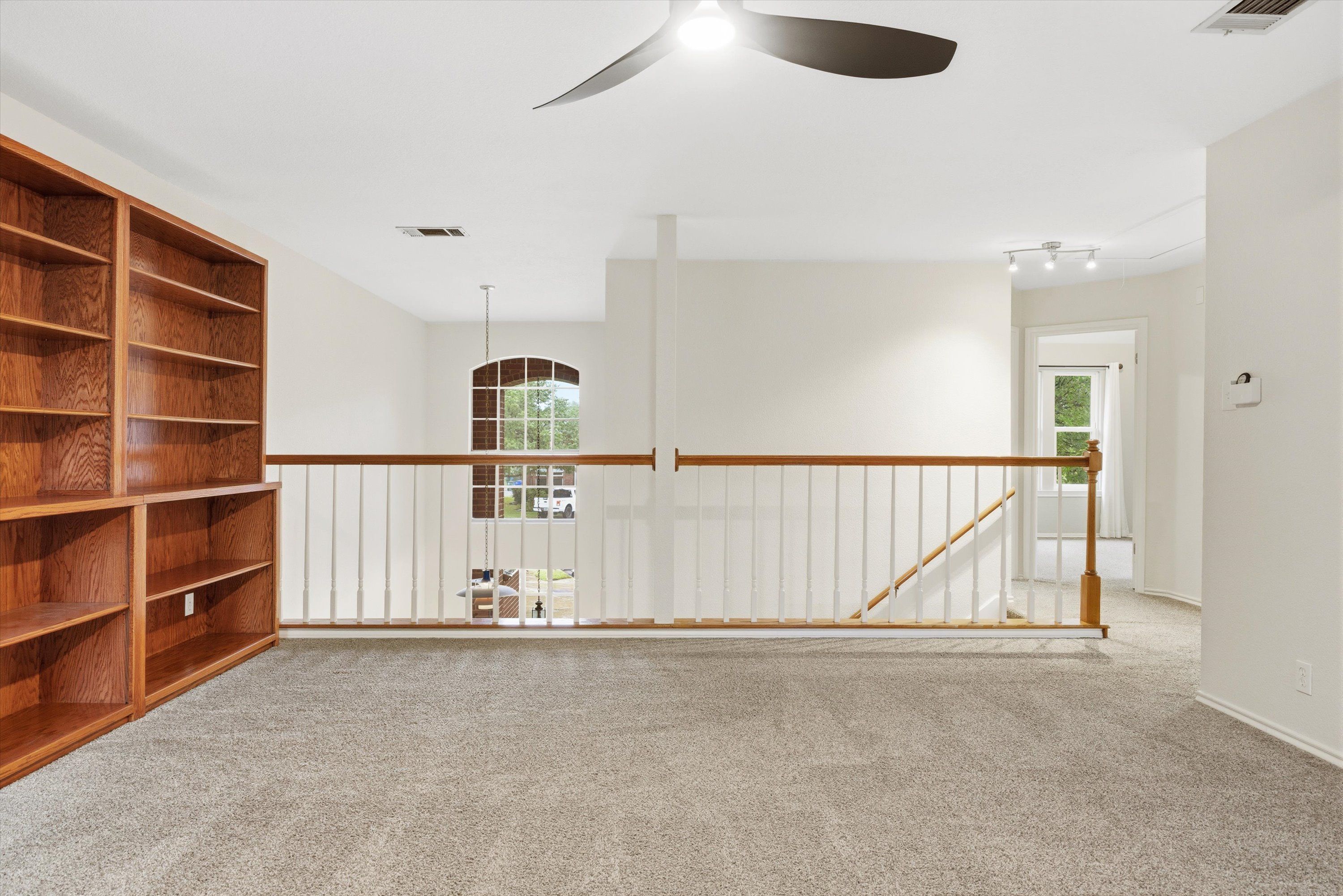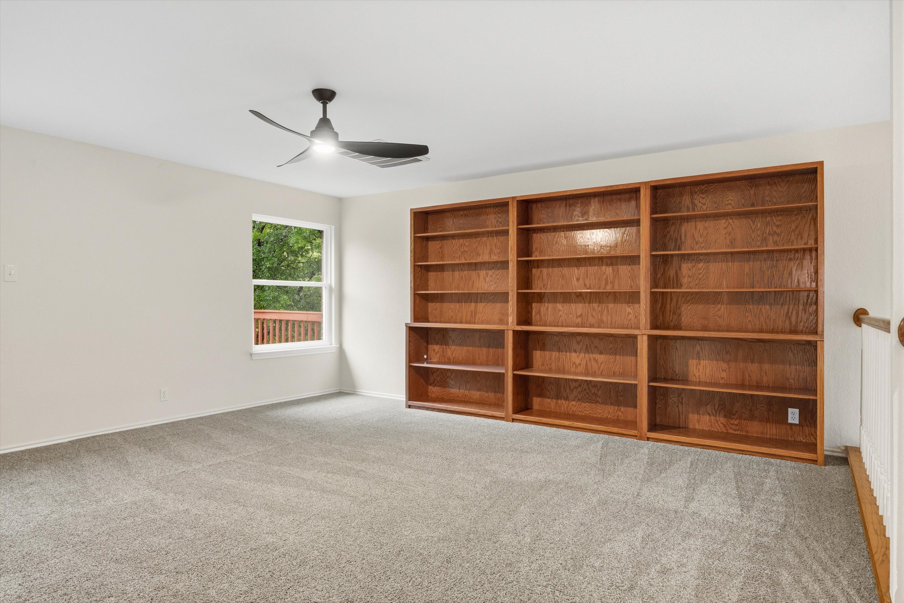 Head upstairs and you'll find three additional bedrooms with carpeted floors, a full bath with tub, and a generous bonus room with built-in bookshelves that works equally well as a playroom, home office, or second living area. Step out onto the second-floor balcony and you’ll enjoy a birds-eye view of the treetops and expansive backyard.