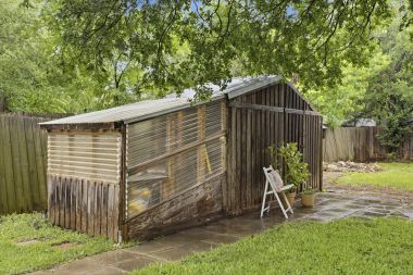 The spacious .28 acre backyard is a wonderful extension of the home. A covered patio with ceiling fans and string lights sits just off the kitchen and runs along the back of the house. It’s the perfect setting for enjoying your morning coffee or unwinding at the end of the day. Whether you’re an experienced gardener or a novice, you’ll appreciate the cute greenhouse with electricity. A separate storage shed provides extra storage for tools and more. The fully-fenced yard is shaded by several mature trees and offers plenty of room for the pets to play, with space left for the addition of a swingset or even a swimming pool if you desire.