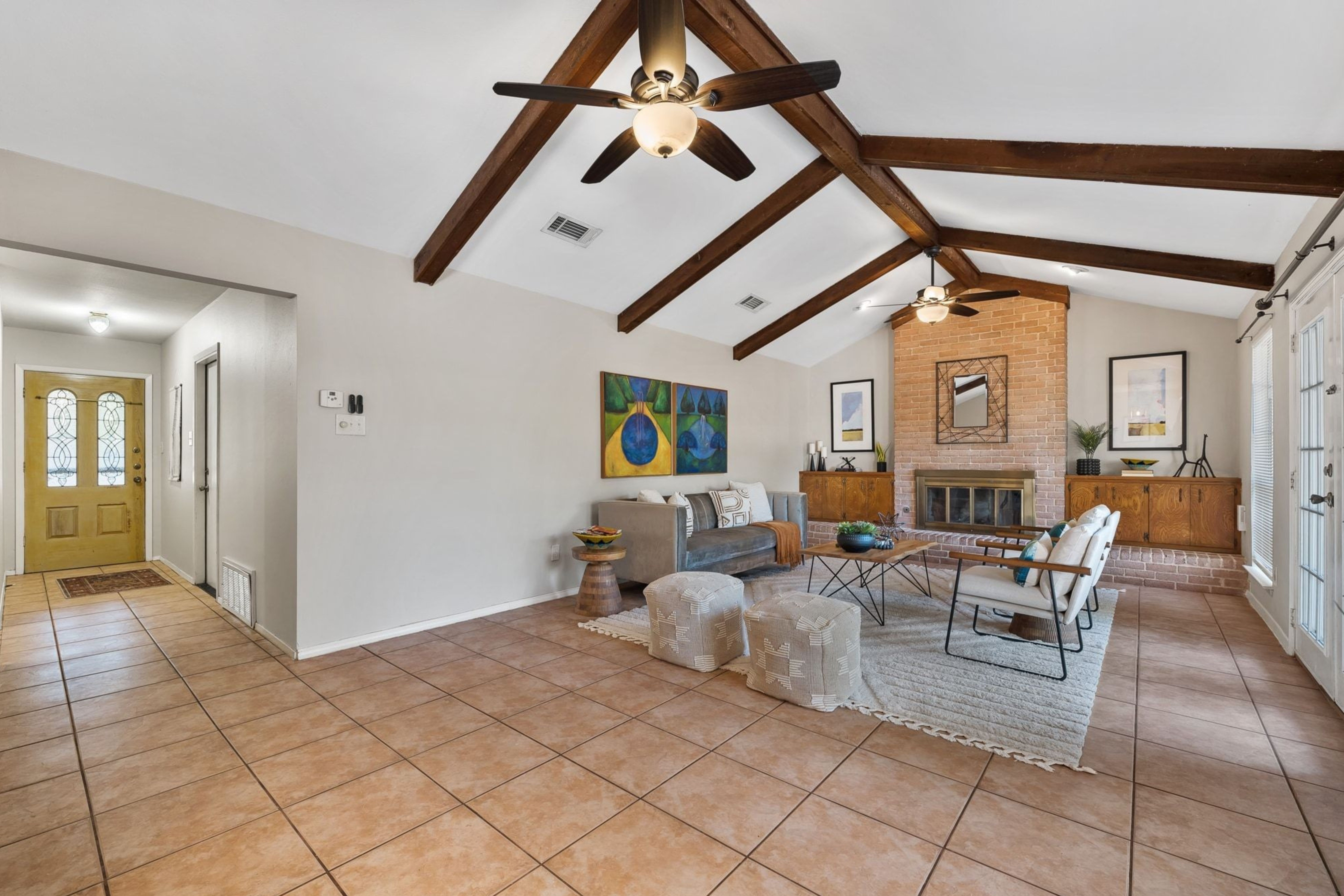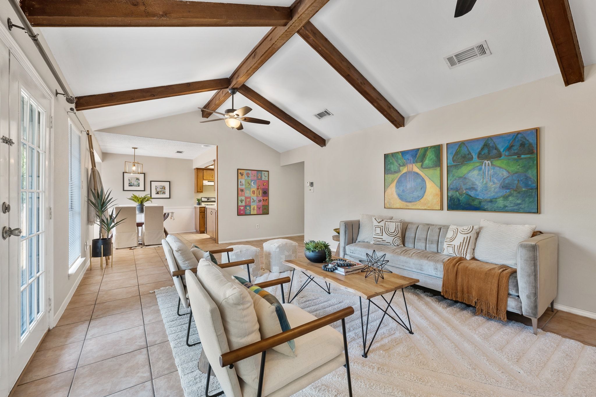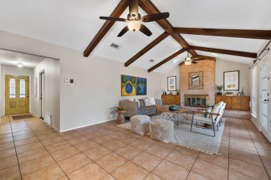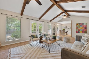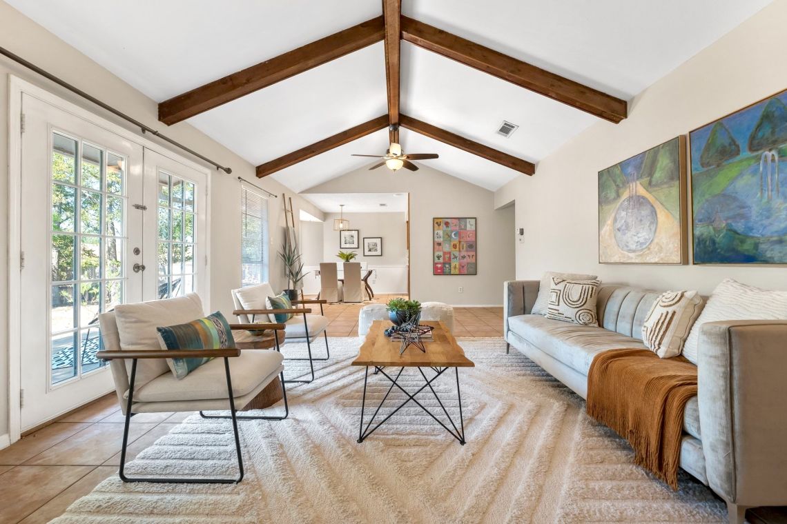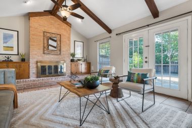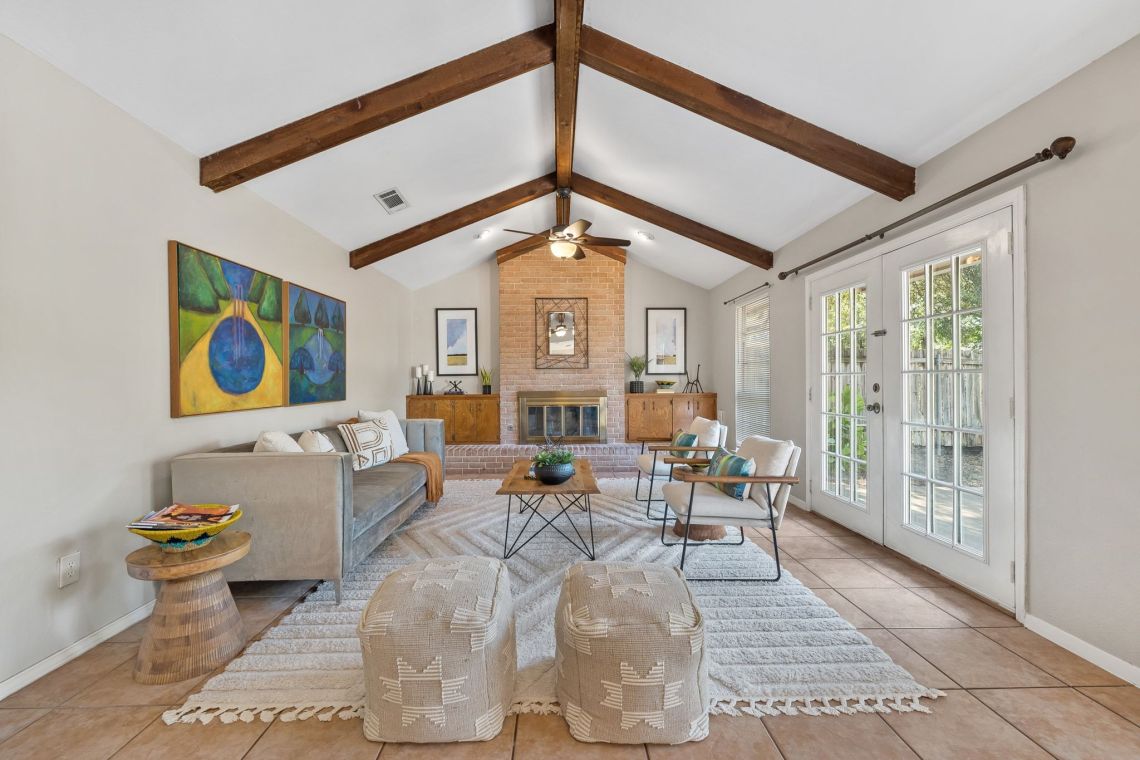 The vaulted living room ceiling with exposed wood beams adds warmth and a sense of openness, while a brick fireplace creates a natural focal point that’s equally suited for lively gatherings or quiet evenings at home. French doors allow sunlight to pour in and provide a seamless connection to the backyard.