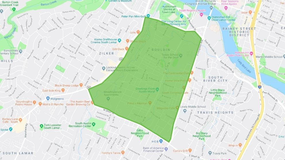 This neighborhood is bordered by Lady Bird Lake on the north, the Union Pacific Railroad Tracks (South Lamar) on the west, Oltorf Street on the south, and South Congress Avenue on the east.